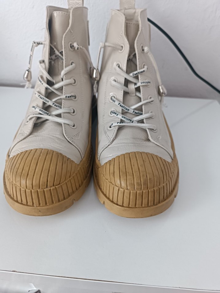 Bej renkte, bağcıklı ve dolgu topuklu kauçuk botlar, günlük sokak stili için uygundur. Desensiz tasarımıyla rahat ve şık bir görünüm sunar.