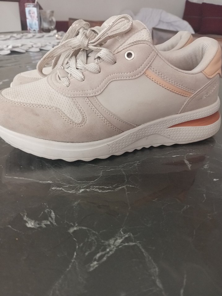 Bej renkte, bağcıklı ve lastik tabanlı kadın sneakers. Sokak tarzı ve stiletto topuklu rahat tasarım, günlük kullanım için uygun. Kinetix