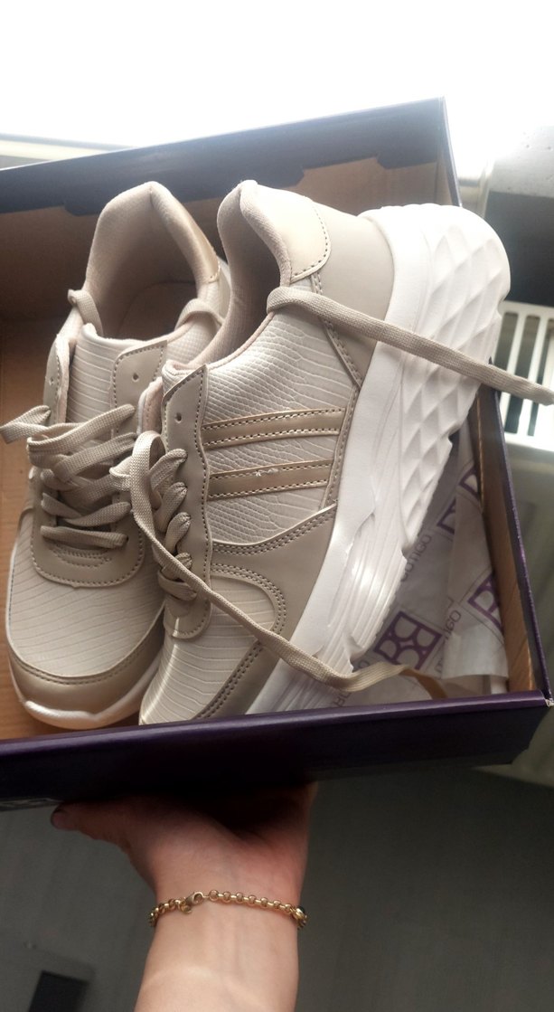 Bej renkli, bağcıklı, dolgu topuklu kadın spor ayakkabısı. Kauçuk malzemeden üretilmiş, sportif ve sokak tarzına uygun.
