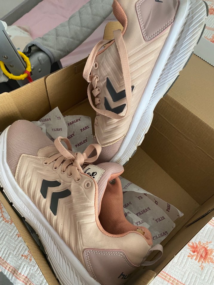 Bağcıklı, baskılı detaylı #hummel kadın yürüyüş ve spor ayakkabısı. İnce topuklu, kauçuk tabanlı, trend sokak stili için uygun.