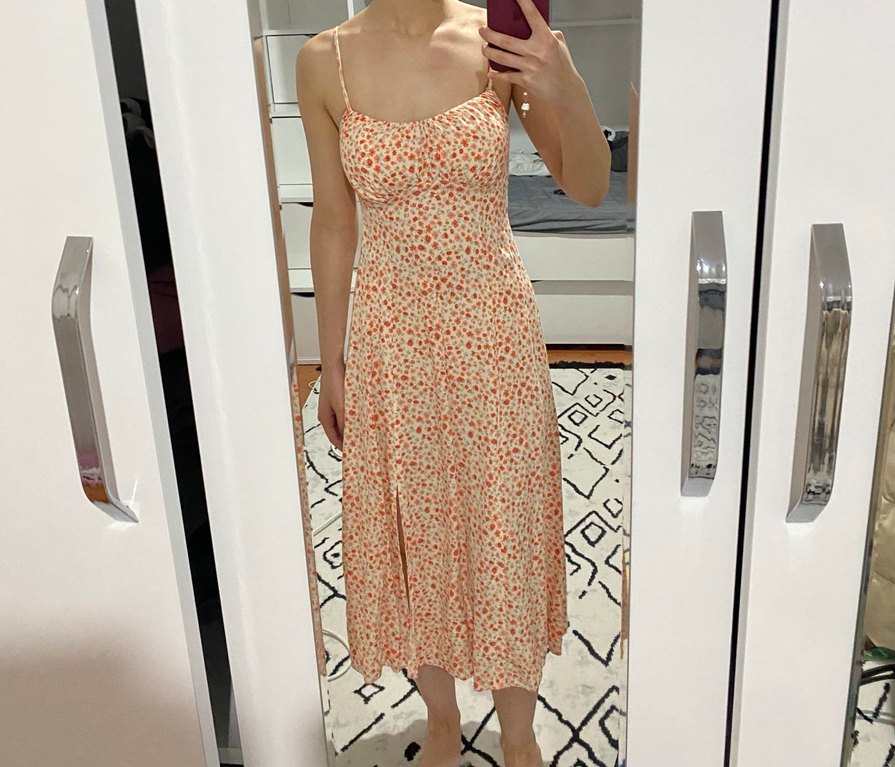 Bağcıklı askılı, vücuda oturan midi elbise, açık bej tonlarında tie-dye desenlidir. Yumuşak sentetik kumaştan, günlük kullanıma uygundur.