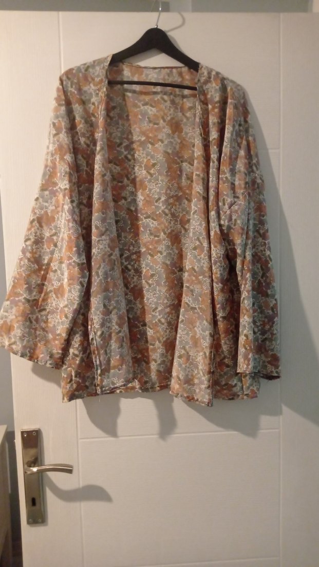 Bej ve gri tonlarda, bağcıklı, midi boy, bol kesim kimono. Uzun kollu ve tekne yaka, yumuşak sentetik kumaştan yapılmıştır. Günlük kullanıma uygundur.