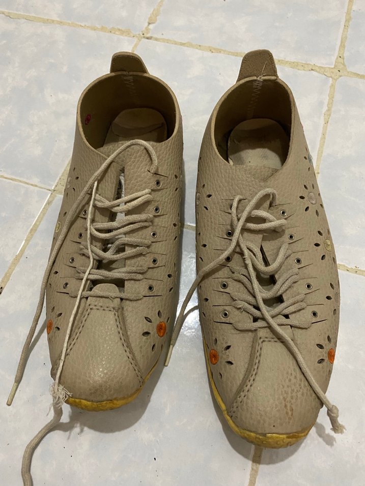 Bej renkli, bağcıklı, ince topuklu kadın spor ayakkabısı. Minimalist ve desensiz tasarımıyla günlük ve sokak stiline uygundur.