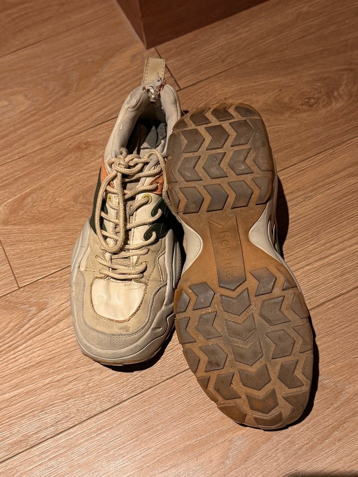 Bej renkli, bağcıklı ve platform topuklu spor ayakkabı. Lastik malzemeden yapılmış, gri detaylı, sokak modası stilinde, günlük kullanım için uygundur. Orijinal marka , son fotoğrafta gözüktüğü gibi arkasında defosu var sadece . Yikaninca uzun süre giyilecek bir ayakkabı olur. Yüksek tabanlı rahat her şeyle uyumlu