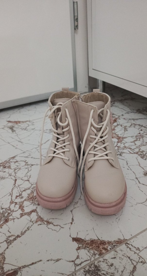 Bej renkte, bağcıklı, stiletto topuklu, kauçuk malzemeden yapılmış kadın botu. Pastel tonlarıyla günlük kullanıma uygun normcore tarzında. kız çocuk botu temiz yırtık leke yok sağlam