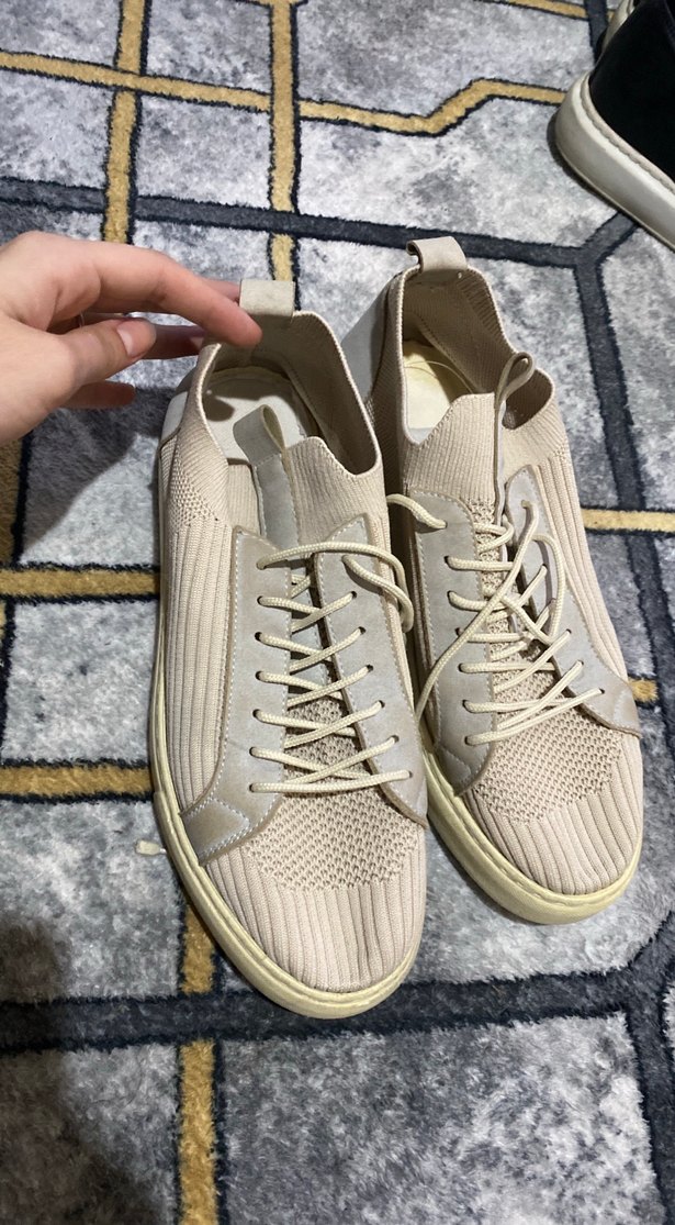 Bej renkte, bağcıklı ve stiletto topuklu kadın spor ayakkabısı. Yumuşak kauçuk malzemeden üretilmiş, günlük rahat kullanım için uygundur.