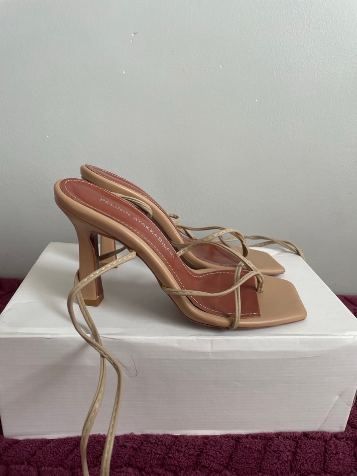 Bej renkte ve bağcıklı topuklu sandalet. Bağçıkları yumuşak deri acıtmaz. Kauçuk malzemeden, minimal ve çağdaş tarzda, romantik akşamlar için uygun.