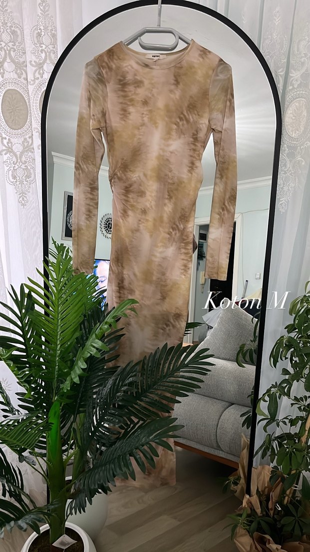 Bej Bağlama Desenli Uzun Kollu Elbise