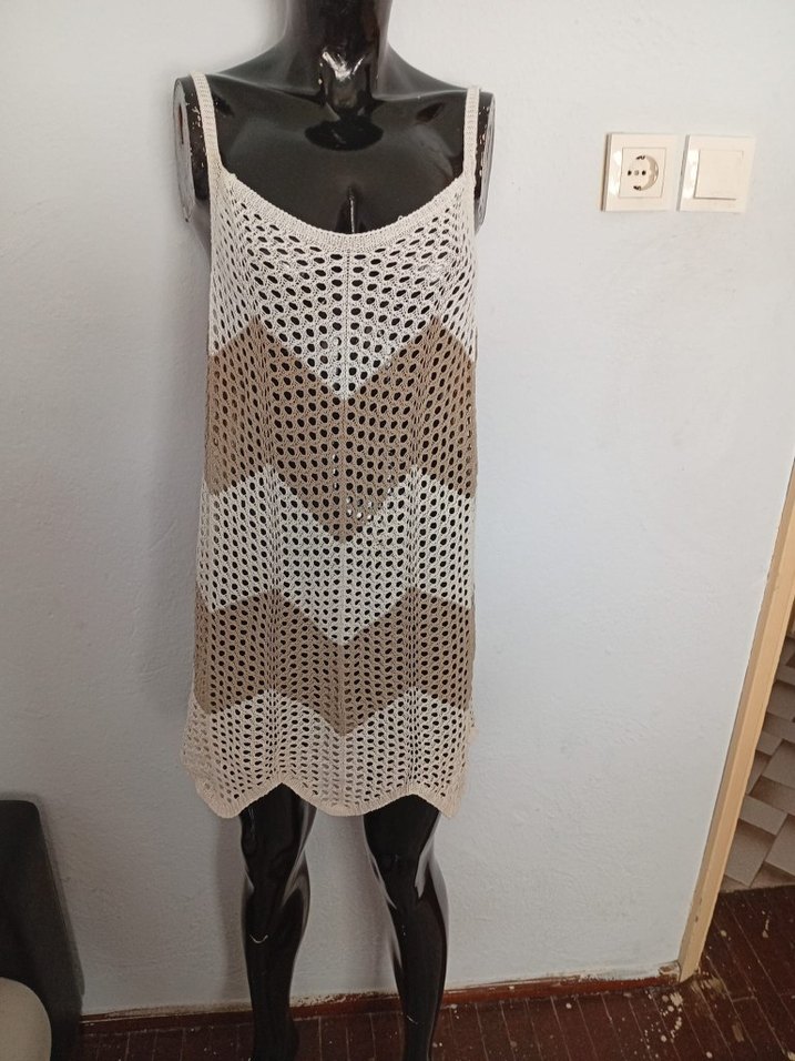 Bej renkli, bağlamalı desenli örgü mini elbise. Salaş kesimi ve askılı, straplez tasarımıyla günlük kullanıma uygun bohem tarzda.