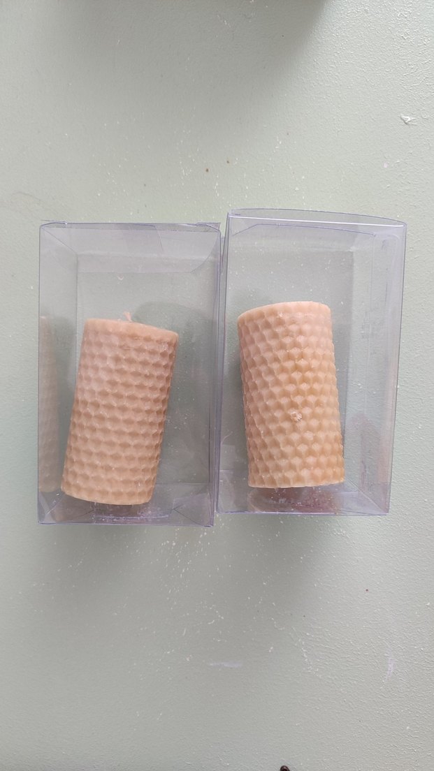 Bal peteği dokulu, bej renkte iki mum seti. Pastel tonuyla yumuşak ve sakinleştirici bir görünüm sunar. ️