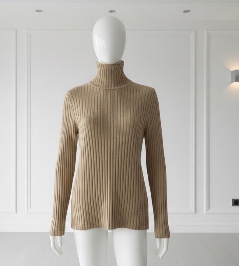 Bej renkli, balıkçı yaka ve uzun kollu, vücuda oturan triko kazak. Günlük kullanıma uygun, ince örgü detaylı.