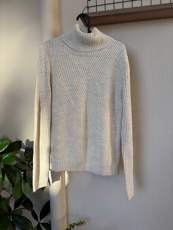 Bej renkli, balıkçı yaka ve uzun kollu örgü kadın kazak. Günlük rahat kullanım için uygun, vücuda oturan kesime sahip.