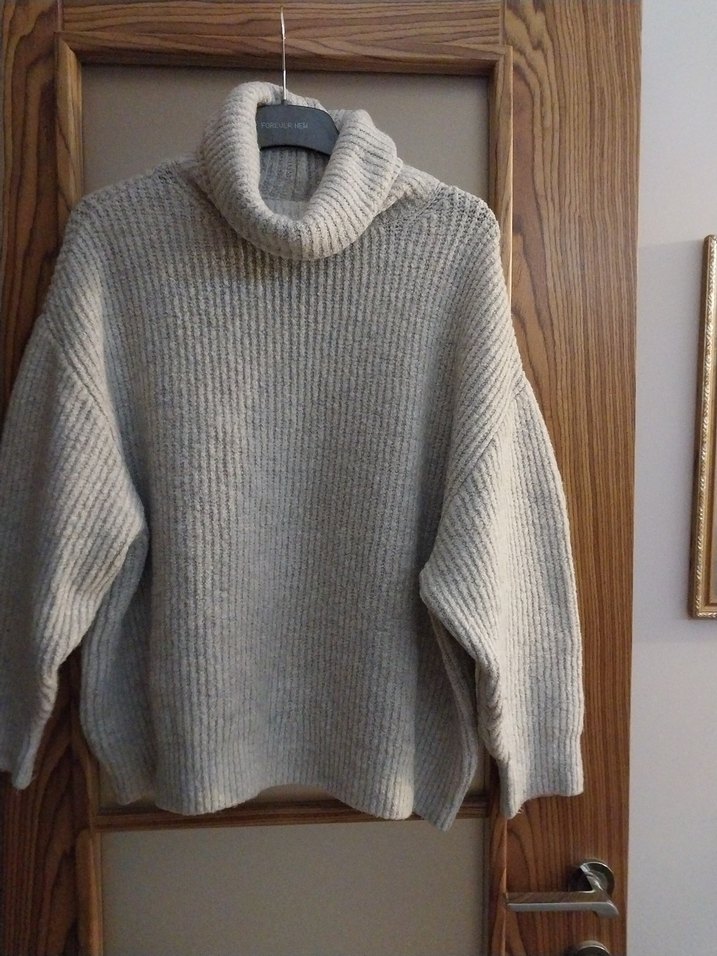 Gri renkli, örgü kumaştan yapılmış, balıkçı yaka ve bol kesim uzun kollu kadın kazak. Günlük kullanıma uygundur. Sorunsuzdur