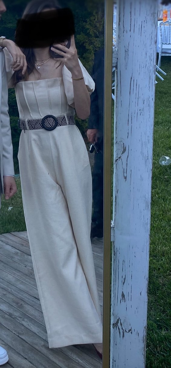 Bej midi tulum, ince kesimli ve tokalı kemerli. Keten gibi kumaştan, düğün ve günlük sokak stiline uygun. Açık renk, desensiz çok şık parça 2 kez giydim sadece