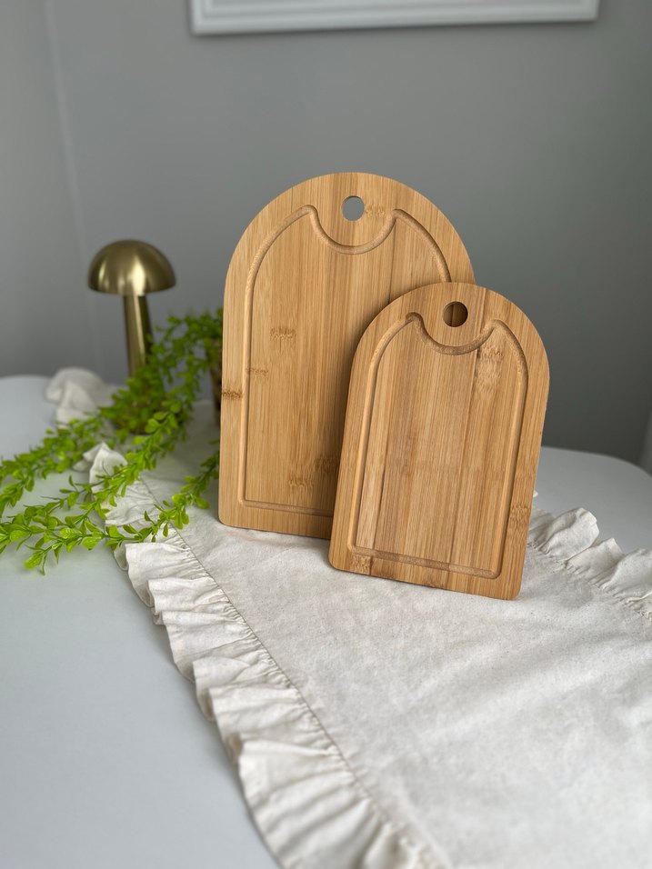 Yuvarlak üst ve asma delikli iki adet bej bambu kesme tahtası seti, mutfakta kullanıma uygundur. ️