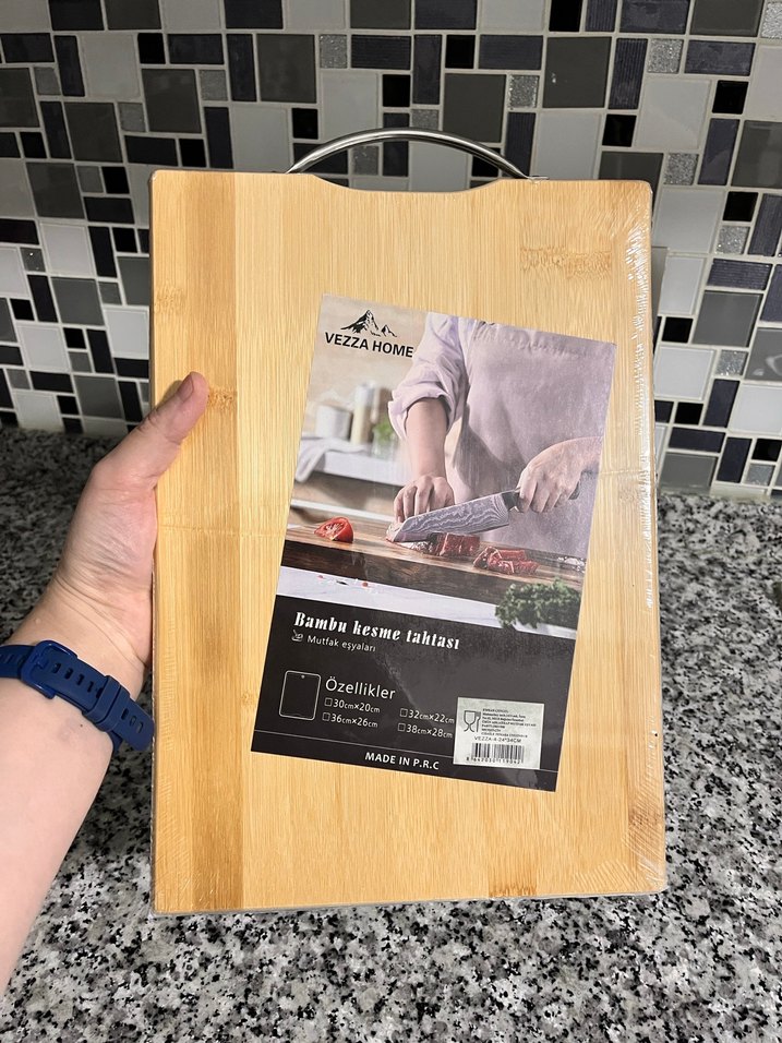 Saplı, bej renkli bambu kesme tahtası. Mutfakta kullanıma uygun, pürüzsüz yüzeye sahiptir. Sıfır ürün