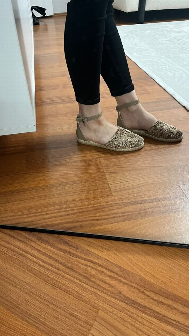 Bej renkli, dolgu topuklu ve tokalı bilek bantlı espadril. Bohem tarzı ve hafif yılan desenli, günlük kullanıma uygun rahat ayakkabı.
