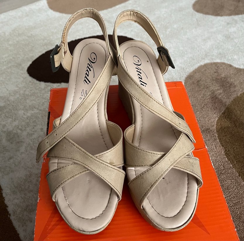 Ayarlanabilir tokalı bantlara sahip bej dolgu topuklu sandalet. Kauçuk malzemeden üretilmiştir. Günlük kullanıma uygun rahat tasarım. Birkaç kere giyildi.