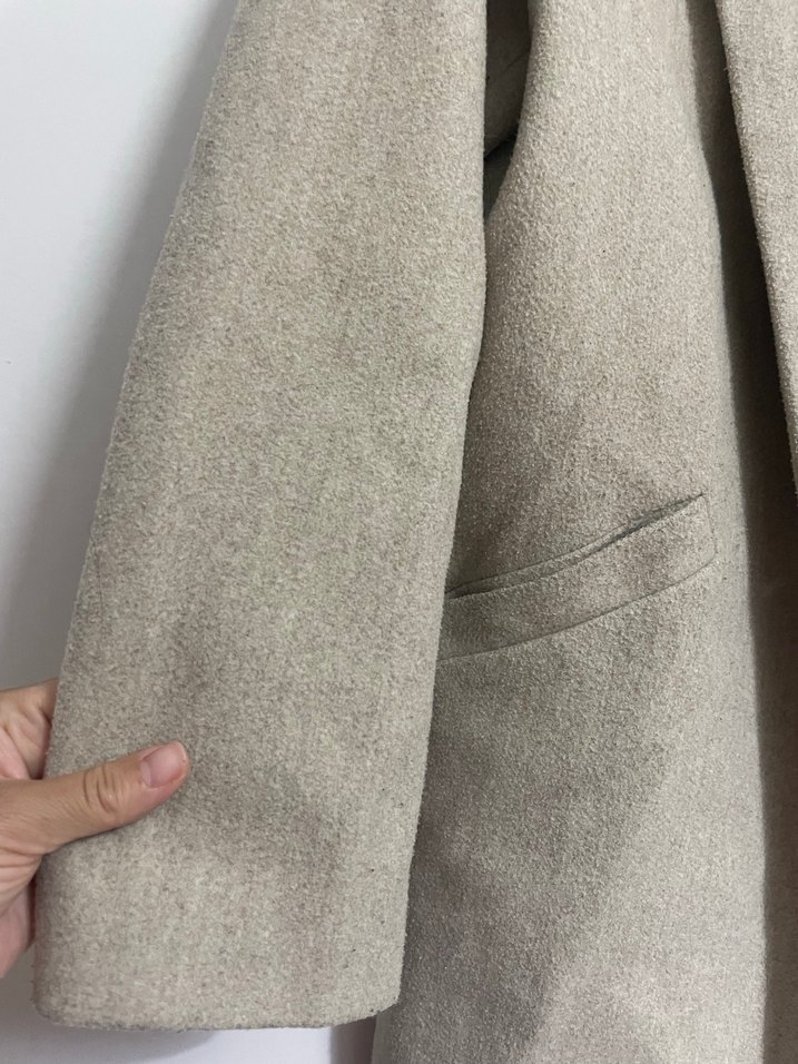 Bej renkli kadın kaban, yaka detayı ve düğmeli ön kısmıyla dikkat çeker. Normal kesim, uzun kollu ve midi boydadır. Minimalist ve sade tarz için uygundur.