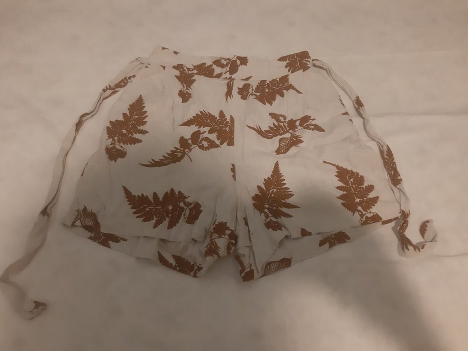 Yaprak desenli, bej renkli, dökümlü yapıya sahip hamile şortu. Yumuşak sentetik kumaştan, rahat ve bohem tarzda günlük kullanım için uygun.