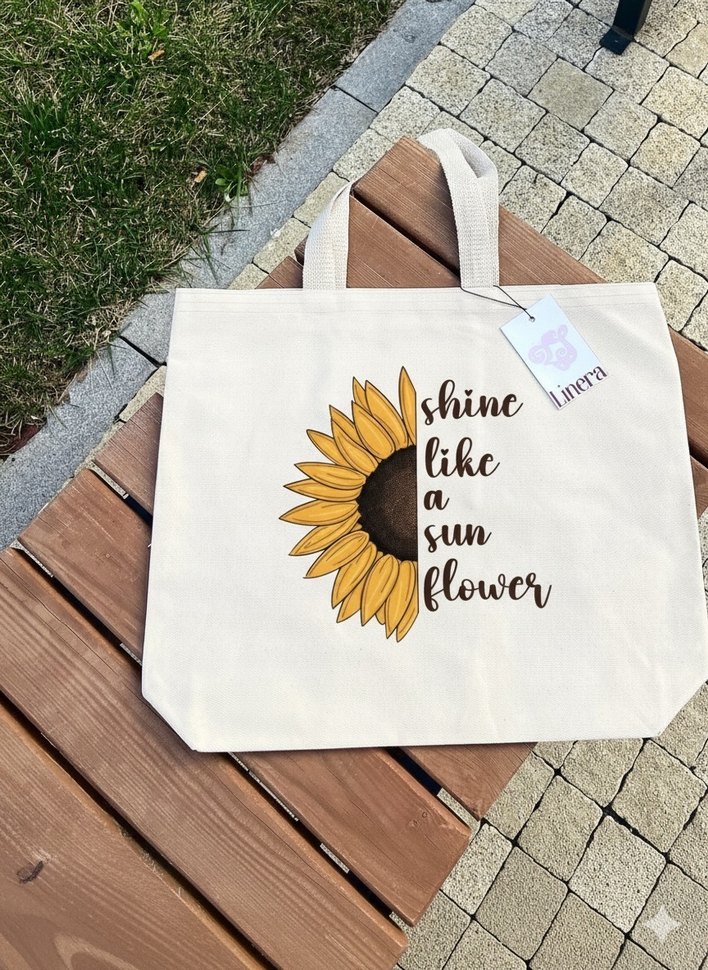 Bej kanvas kumaştan, üzerinde ayçiçeği ve 'shine like a sunflower' yazısı bulunan baskılı bohem tarzda kadın çanta. Dayanıklı kulplu.