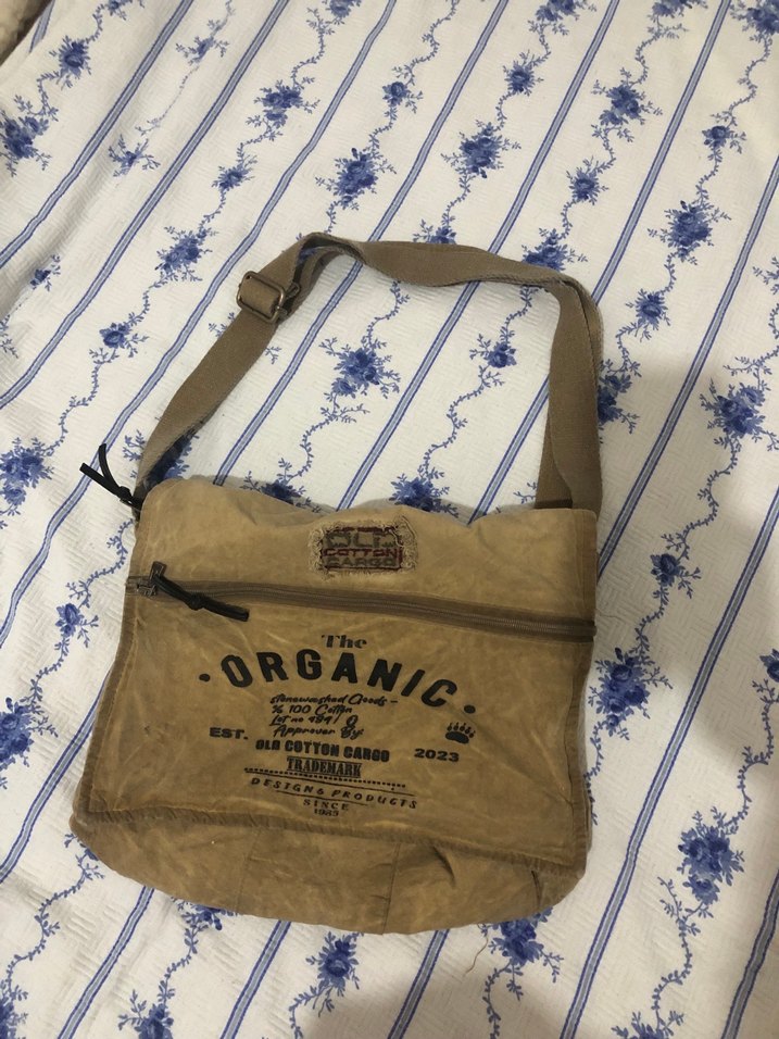 Bej renkli, baskılı ve tokalı askılı vintage tarzda bohem omuz çantası. Üzerinde "The Organic 2023" yazısı bulunur.