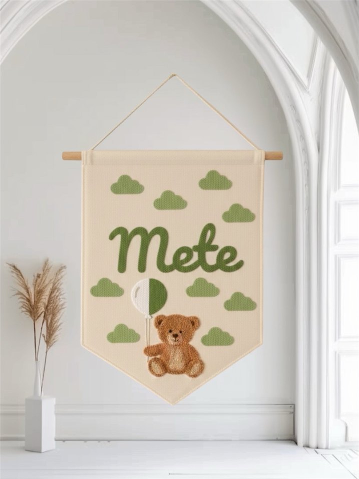 Bej renkli, yumuşak ve sıcak kumaştan yapılmış çocuk duvar süsü, baskılı ayıcık, yeşil bulutlar ve "Mete" ismi pastel tonlarda bulunur. İstediğiniz renkte ve isimde yapılır