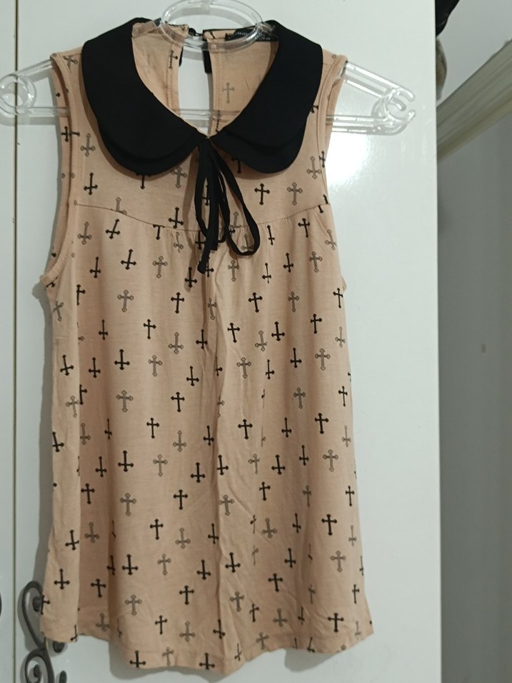pudra renkte, desenli, siyah yakalı, kolsuz ve bol kesim bluz. Günlük kullanım için uygundur.