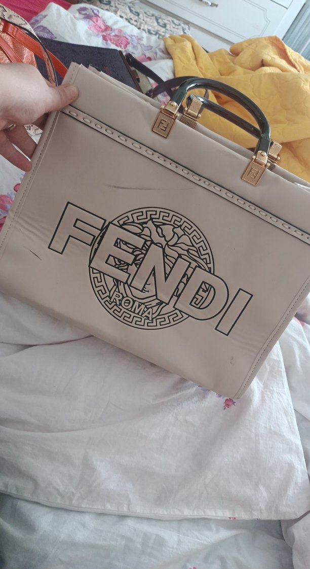 Bej renkte, baskılı Fendi logosu ve fermuarlı kapanışı olan deri kadın çantası. Günlük kullanıma uygun, trend sokak stili için ideal.