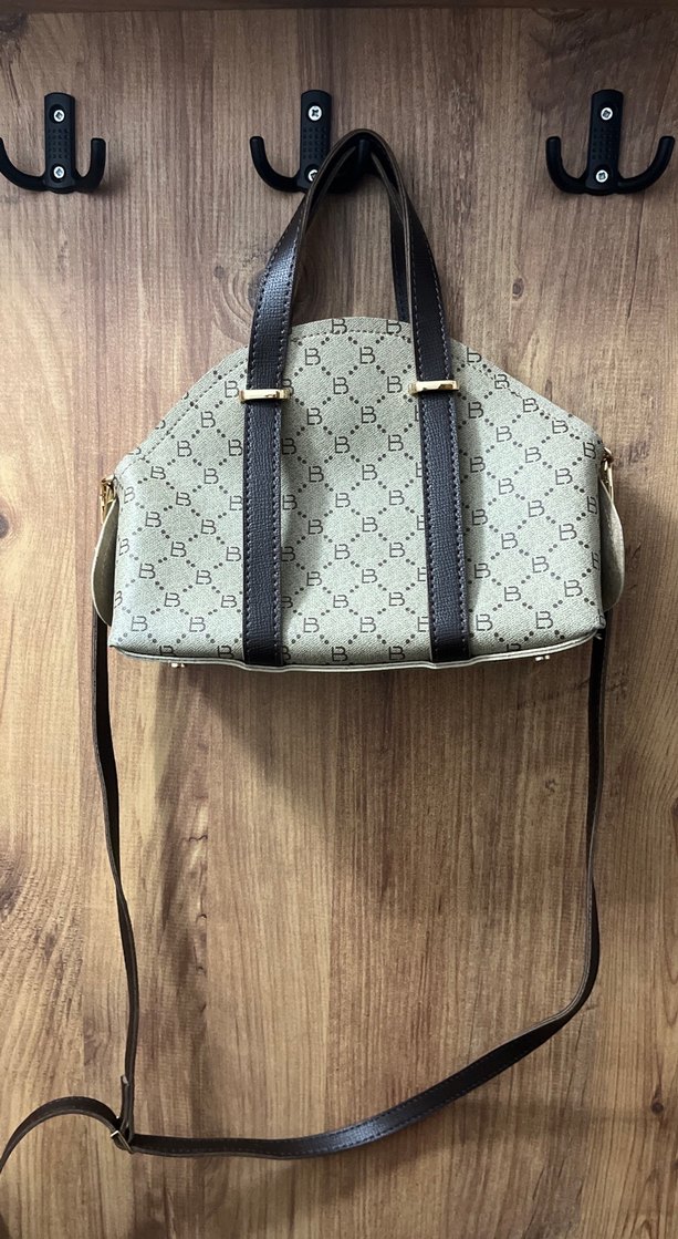 Bej baskılı deri kadın çanta, koyu gri tokalı askılarla. Günlük kullanıma uygun, çağdaş Paris tarzında klasik şıklık sunar.