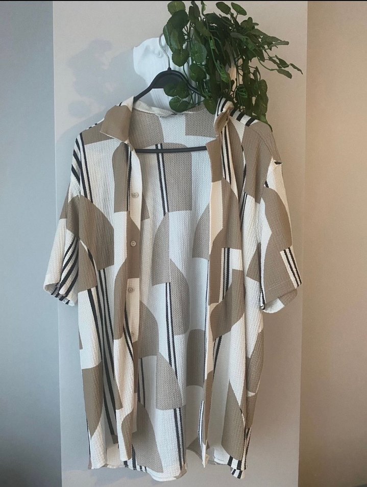 Keten kumaştan, dökümlü ve baskılı desene sahip bol kesim erkek gömlek. Kısa kollu, tekne yaka ve uzun boylu, günlük kullanım için uygun. Bej ve gri tonlarında modern tasarım.