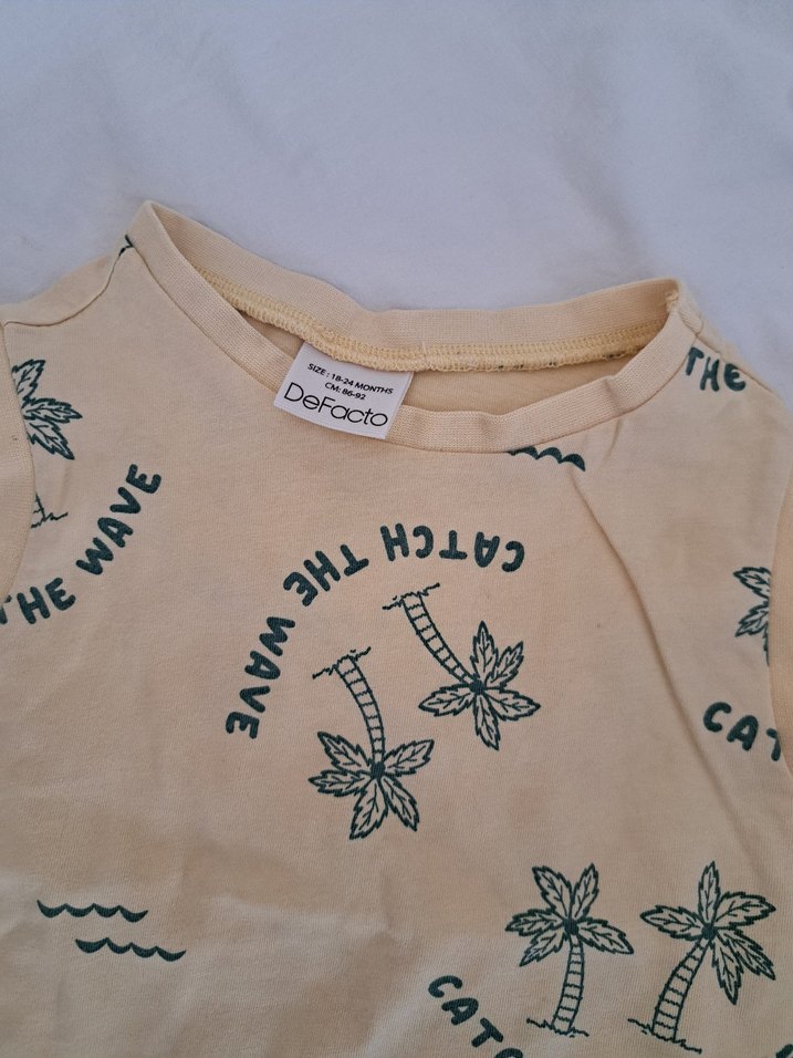 Pamuklu, bej renkli, kısa kollu erkek tişörtü. Baskılı palmiye desenleri ve düğme detayları bulunur. Salaş kesim, yuvarlak yaka, bohem tarzı yansıtır.