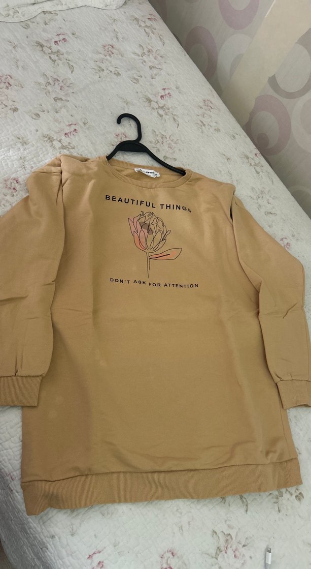 Bej, baskılı çiçek deseni ve düğme detaylı, uzun kollu, yuvarlak yaka, bol kesim kadın sweatshirtü. "BEAUTIFUL THINGS, DON'T ASK FOR ATTENTION" yazılı. Rahat sentetik kumaştan.