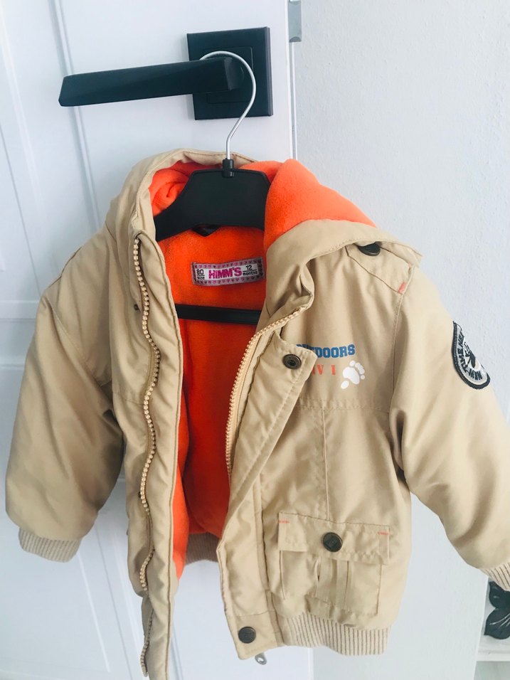 Bej renkli, baskılı ve düğmeli erkek çocuk montu, oturmalı kesime ve yakalı tasarıma sahiptir. İç kısmı yumuşak turuncu kumaşla kaplıdır.