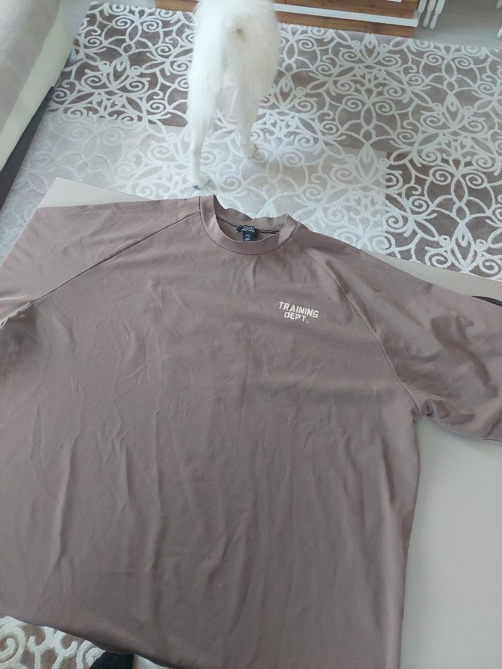 Pamuklu, kısa kollu, bisiklet yaka, bej renkli ve baskılı bol kesim erkek tişörtü. "TRAINNG" yazısı ile rahat sokak stili sunar.