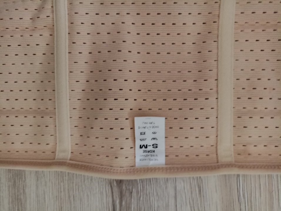 Bej renkli, baskılı ve vücuda oturan göğüs destek korsesi, normal midi boyda, rahat kullanım sağlar. Beden S-M.