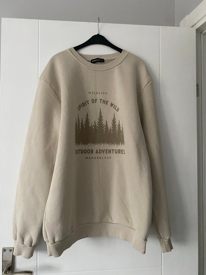 Bej renkli, bol kesim kadın sweatshirtü, yuvarlak yaka ve uzun kolludur. Yumuşak kumaştan yapılmış, doğa temalı baskıya sahiptir. Rahat ve şık bir sokak stili için uygundur.