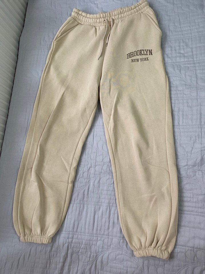 Yumuşak pamuklu, baskılı 'BROOKLYN NEW YORK' detaylı, rahat kesim bej eşofman altı. Elastik bel ve bileklerle sportif tarz için uygundur. ️