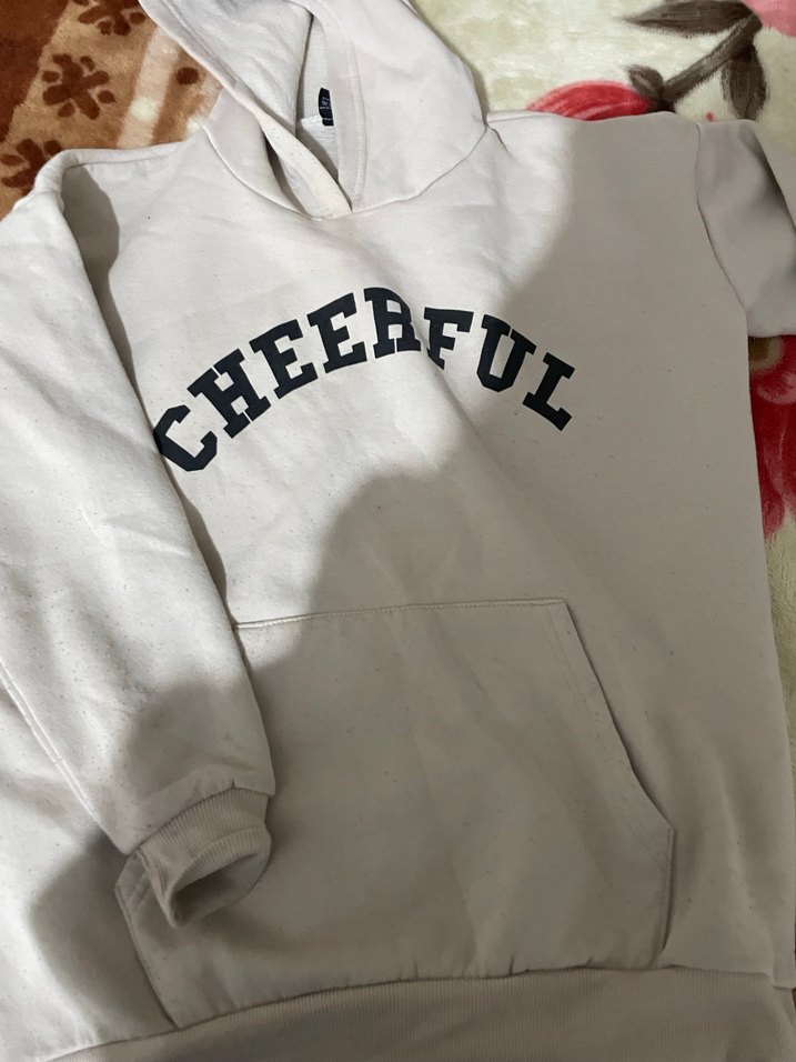 Kadınlar için bol kesim, uzun kollu ve bisiklet yaka sweatshirt. Yumuşak ve sıcak kumaştan, 'CHEERFUL' baskılı ve ön cep detaylı, açık gri tonlarında.