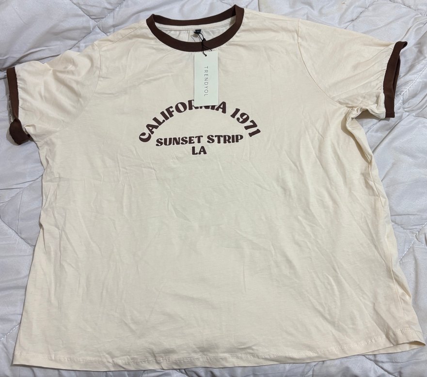 Bej renkli pamuk kumaştan, kısa kollu ve yuvarlak yakalı, rahat kesim kadın tişörtü. Üzerinde California 1971 ve Sunset Strip LA yazılı baskı bulunur. Sıfır etiketli üründür.