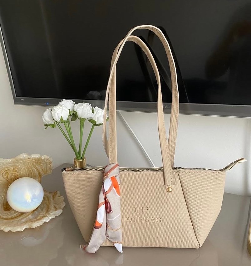 Bej sentetik kumaştan, baskılı detaylı ve dekoratif fularlı kadın omuz çantası, günlük kullanım için şık ve çağdaş tasarım.