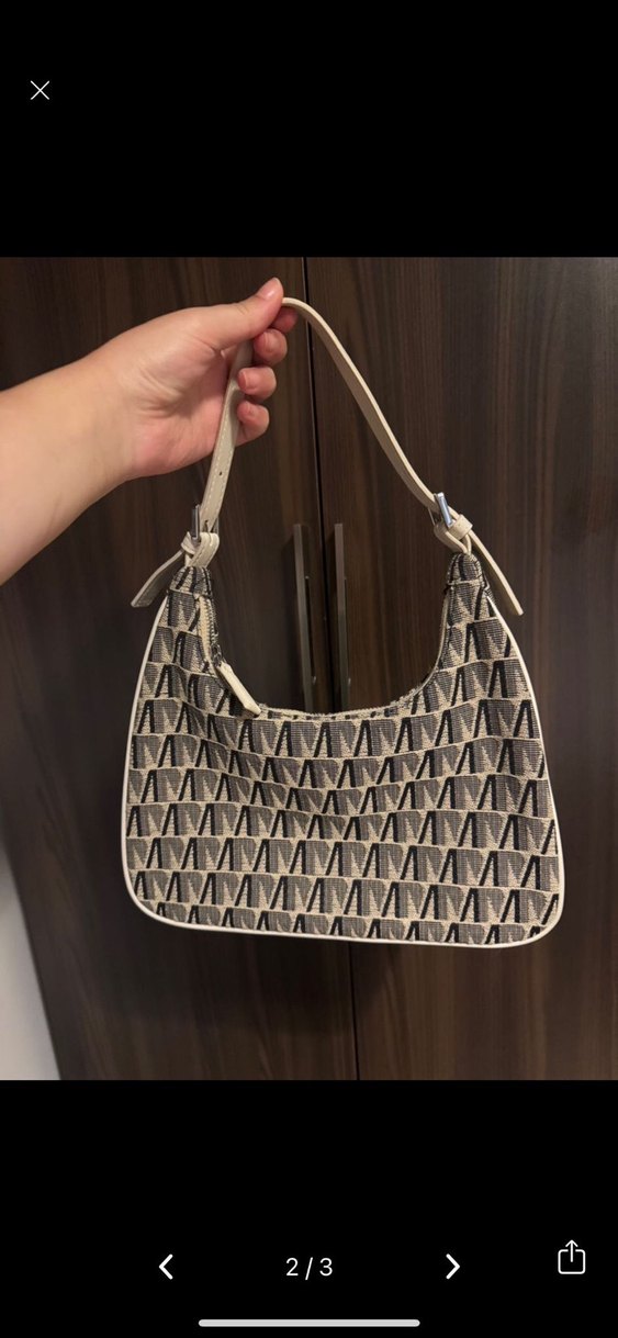 Gri baskılı, fermuarlı bej renk sentetik kumaş omuz çantası. Minimalist sokak stili, günlük kullanım için uygundur.