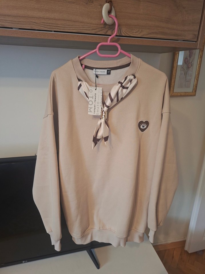 Bej renkli, uzun kollu ve rahat kesim kadın sweatshirtü, baskılı kalp detayı ve şık fular aksesuarıyla günlük kullanım için uygundur.