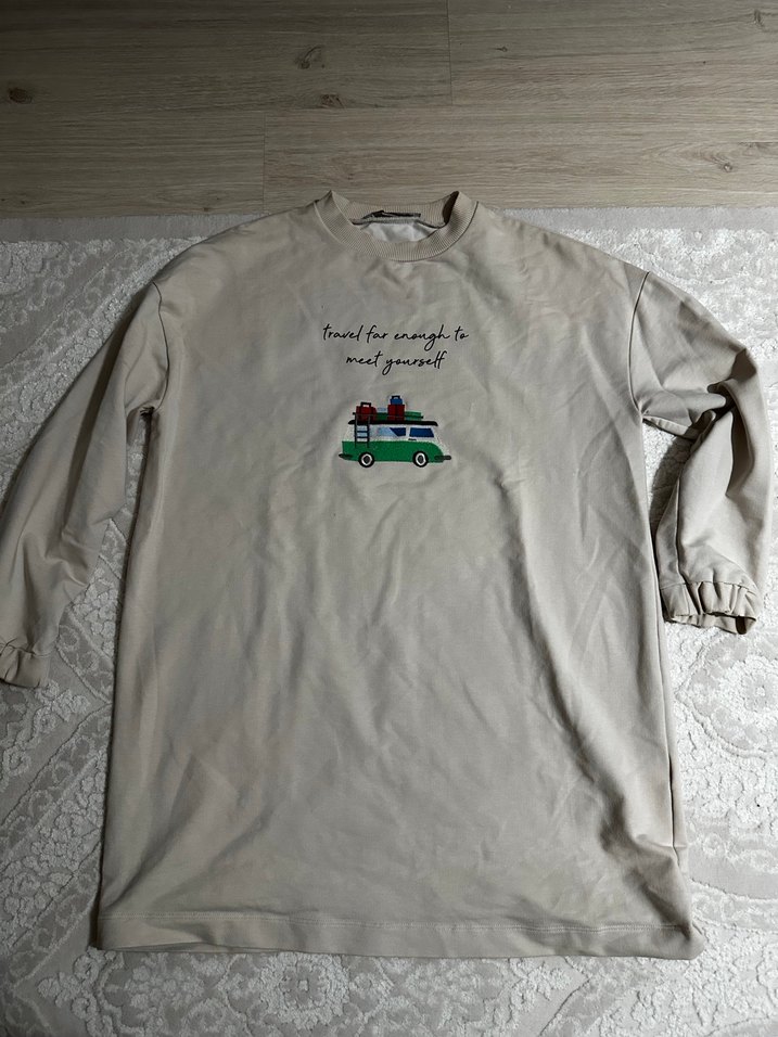 Bej renkte, uzun kollu, yuvarlak yaka kadın sweatshirtü. Önünde bagajlı araba baskısı bulunur. Pamuklu, rahat kesim ve kısa boydadır. Günlük ve şık stil için uygundur.