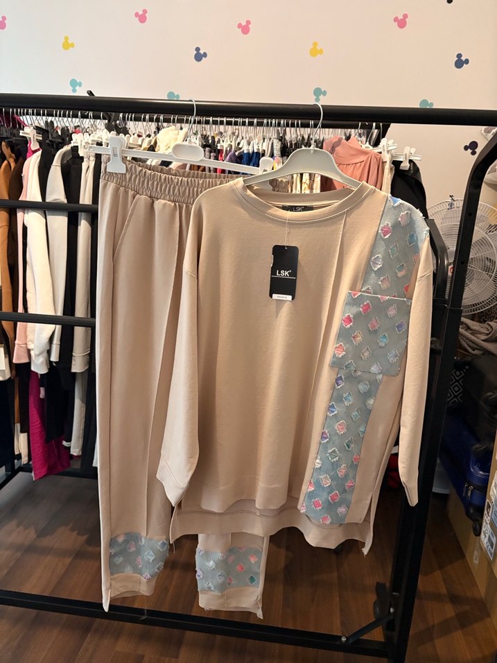 Bej renkli, uzun kollu, baskılı desenlere sahip, bol kesim kadın takım. Günlük rahat kullanım için yumuşak tekstil kumaştan üretilmiştir.