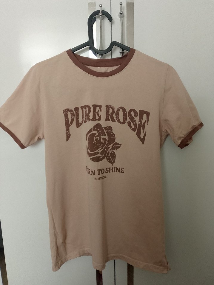 Bej renkli, pamuklu kumaştan yapılmış, kısa kollu ve yuvarlak yakalı kadın tişörtü. Vintage tarzda baskılı "PURE ROSE" deseni ve kontrast renk detayları bulunur. Rahat ve şık görünüm sunar.