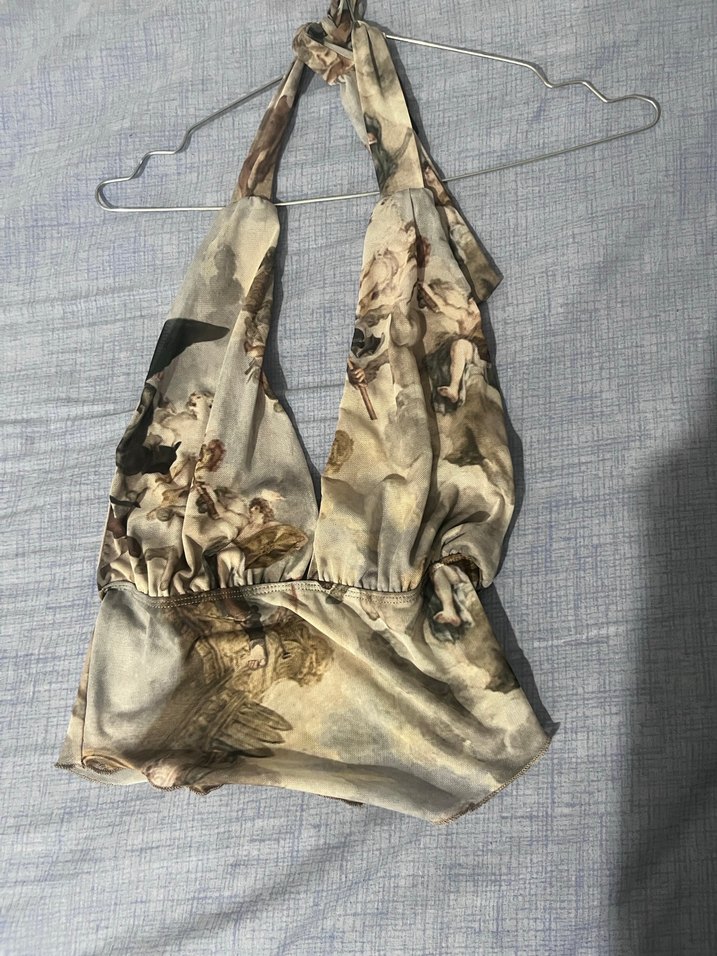 Yumuşak keten kumaştan yapılmış, bej baskılı, drapeli ve straplez tasarımlı dar kesim midi uzunlukta büstiyer. Sokak modası ve günlük kullanım için uygundur.