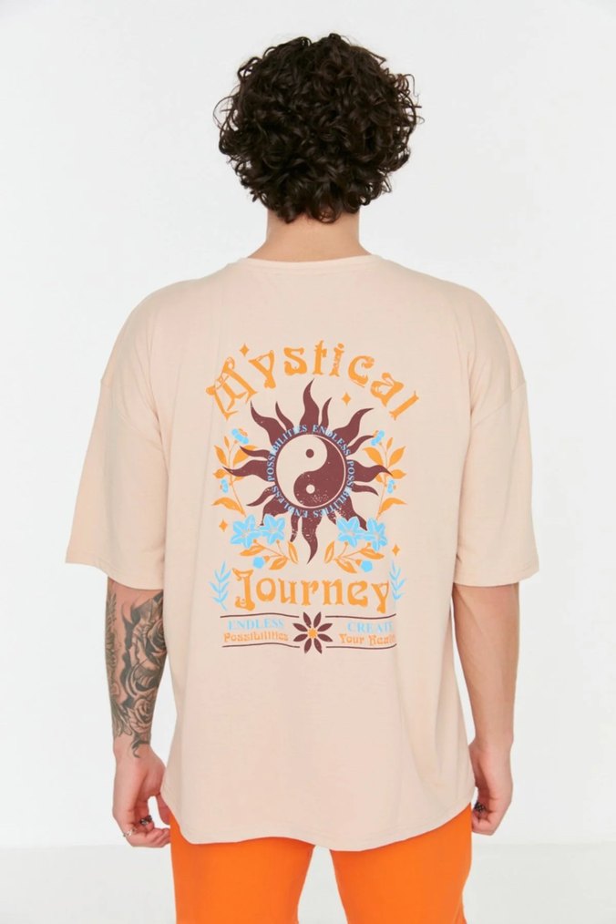 Bej renkte, kısa kollu ve bol kesimli erkek tişört. Arkasındaki desenleri hafif deforme olmuştur.