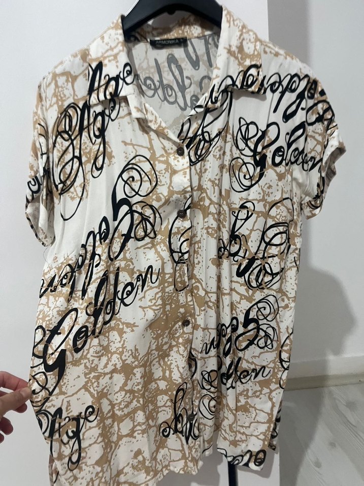 Kısa kollu, yakalı ve düğmeli bej renkli keten gömlek. Baskılı deseni ve bol kesimiyle günlük kullanıma uygun, parlak görünümlü.