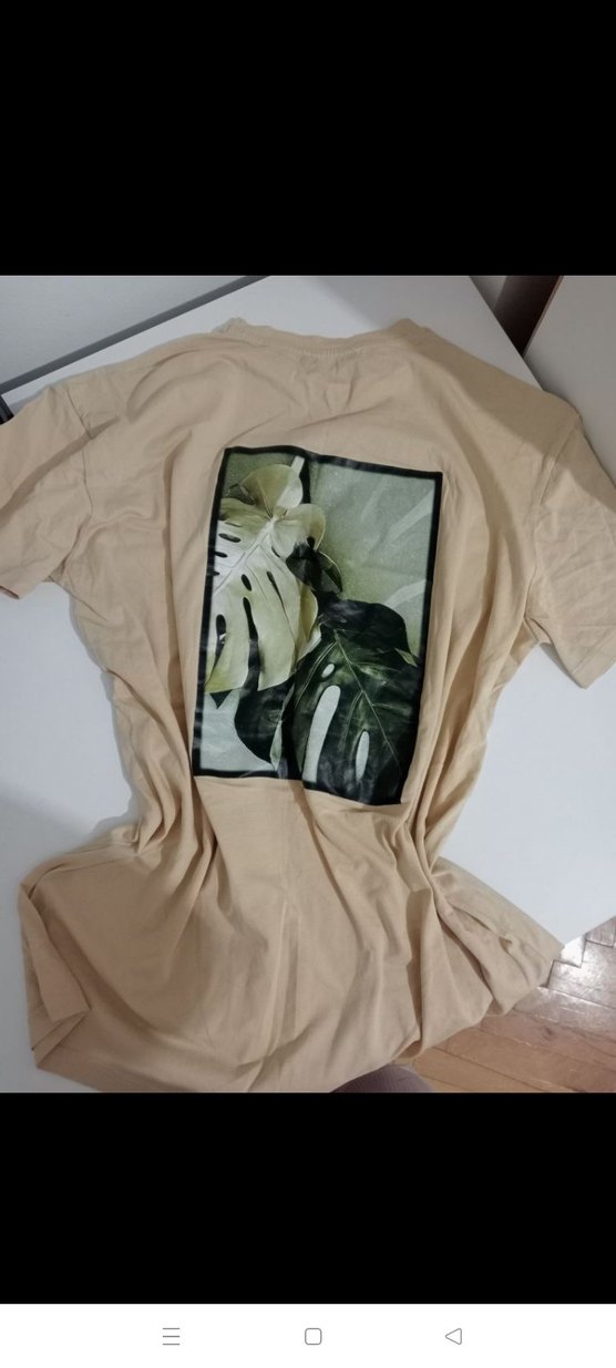 Bej renkli, kısa kollu ve oversize kesim tişört. Sırtında baskılı yaprak deseni bulunur.sırt baskılı kadın tişört tertemiz hiç bir kusuru yok hiç giyilmedi s beden yazıyor ama m ve l bedene de olur iki kol altı arası 52cm uzunluk 67cm SON FİYAT